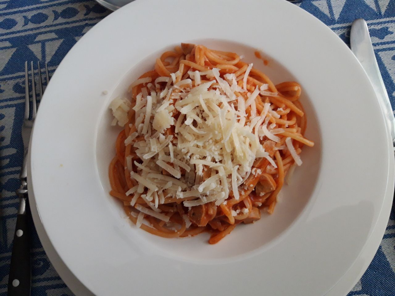 Espaguettis con tomate casero, una bratswurst picada y pasada por sartén, y queso curado ahumado rallado.