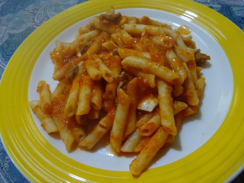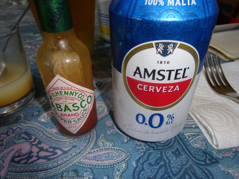 Macarrones con tomate frito casero, carne picada de ternera al ajillo y huevo duro, para beber Amstel 0,0 con Tabasco.