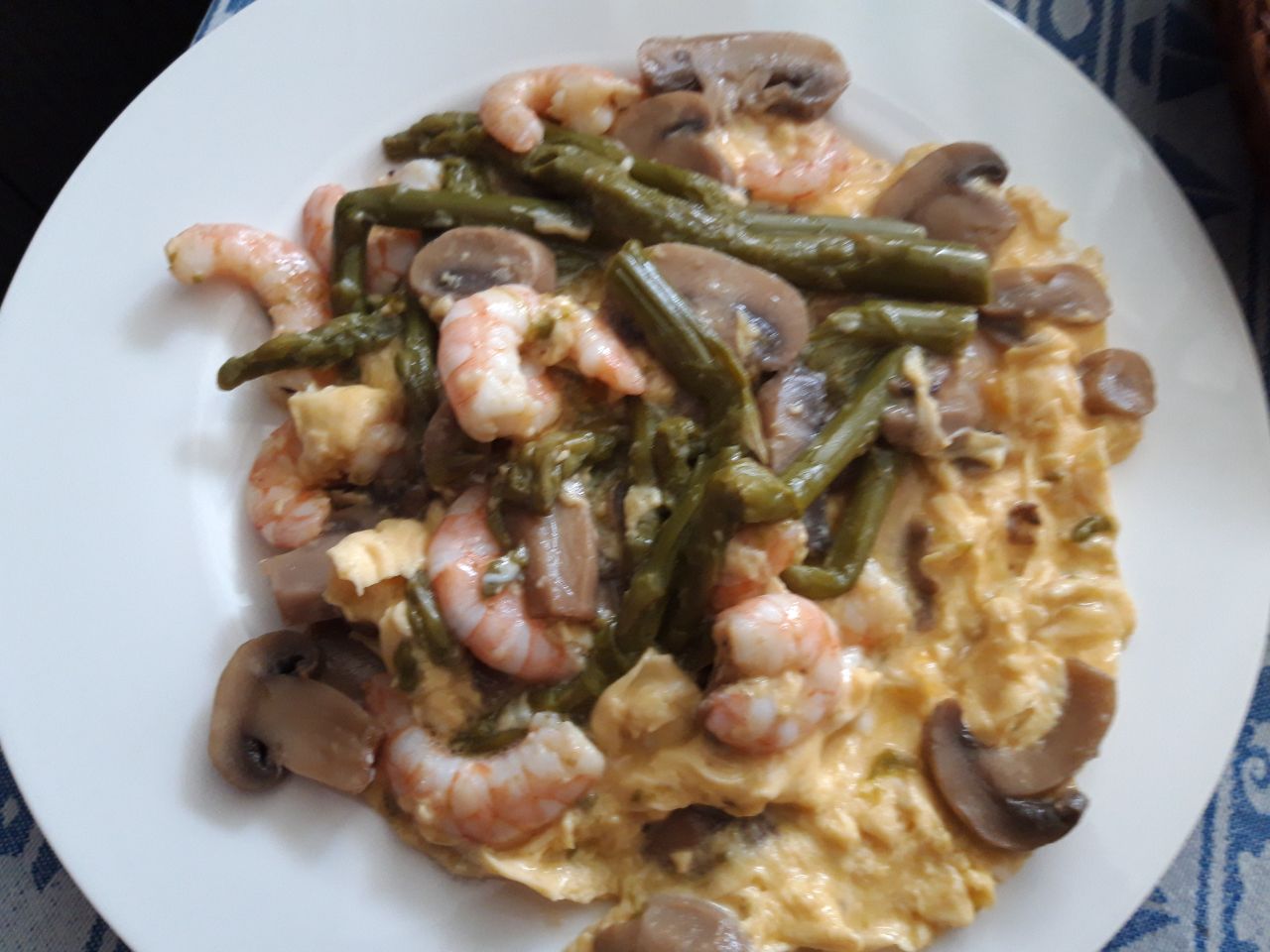 Revuelto de espárragos, champiñones y gambas.