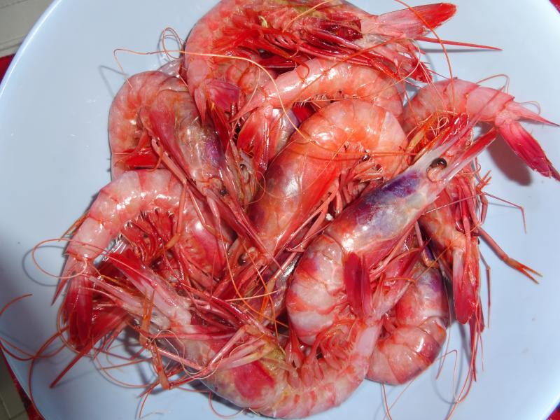 Aperitivo a base de gamba roja de Palamós a la plancha remojadas con Albariño Terras Gauda, de plato con fundamento bacalao con tomate y de postre pera de Rincón de Soto.