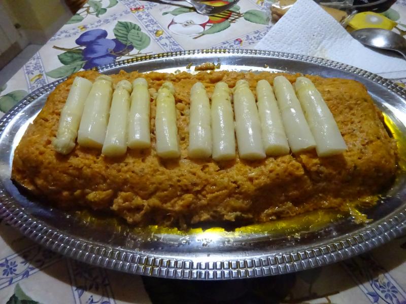 Se asa en el horno con un chorrito de aceite previo toque salino, 20 minutos a 180º será suficiente, se saca, se deja enfriar y se desmiga, luego se añaden 4 huevos crudos, tomate frito casero, nata de cocinar, pìmienta negra y golpe de nuez moscada, se mezcla bien todo y se coloca en un molde untado de mantequilla, se mete en el horno hasta que quede hecho, se pincha con una aguja de tricotar y si sale mojada hay que esperar hasta que salga seca, para que no se queme hay que taparlo (el molde) con papel de aluminio, se saca, se enfría, se desmoldea y se decora con unas yemas de esparrago, se puede acompañar de mayonesa casera.