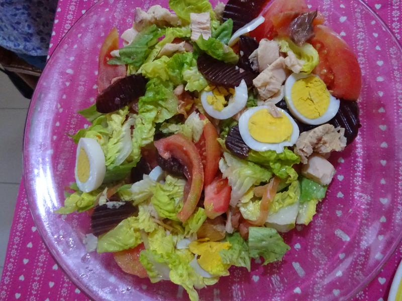 He añadido a la ensalada LTC unos cuantos ingredientes premium, remolacha, zanahoria rallada, tacos de bonito, huevo duro y la he aderezado con el ya citado vinagre de manzana y aceite de oliva extra virgen de la variedad Arbequina, sal de las Salinas de Añana en Alava.