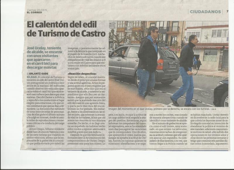 Item más, ese carril bici se colocó más por razones electoralistas que prácticas, se anda muy poco en bici por Castro y las personas mayores del coche solo pretendían parar un momento para dejar las maletas, a partir de cierta edad cargar con pesos no es tu deporte favorito y lo tengo probado en mis propias carnes, no es que me lo haya contado un pajarito, además se ve claramente que no invaden por completo el carril bici de marras impidiendo el paso del pelotón :wink: