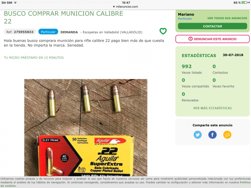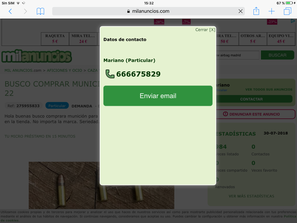 esta mañana estuve en mi intervencion y le pase el enlace del anuncio y ls capturas de pantalla y an dicho que van a investigarlo tanto una intervencion de madrid que a sido la que me llamo para que le solicitara bien la informacion e imagenes y mi intervencion de murcia,esperemos que pillen a gentuzilla como esa y se les quiten las ganas