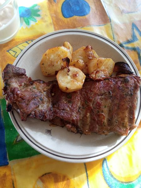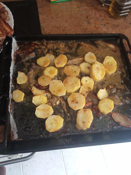 Durante la primera hora y media la.bandeja del horno tapada con papel aluminio ( previamente le puse unos trozos de cebolla , para la próxima se los pondré a la vez que la patata) dejar que se cuezcan las costillas sin la.patata , luego retirar el papel aluminio y poner la patata , durante un par de horas más a 150º,. dorar por ambos lados agregando el jugo del marinado y después retirar las costillas para que se termine de hacer bien la patata. Cuando este echa colocar las costillas de nuevo para que se calienten con el calor residual apagando el horno y voala!! A gozar..... Los huesos salen solos y bien limpios , sin necesidad de rader con ños dientes