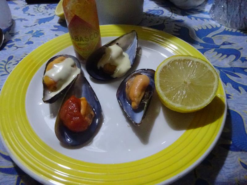 Mejillones de roca al gusto, tomate frito casero, mayonesa o zumo de limon.
