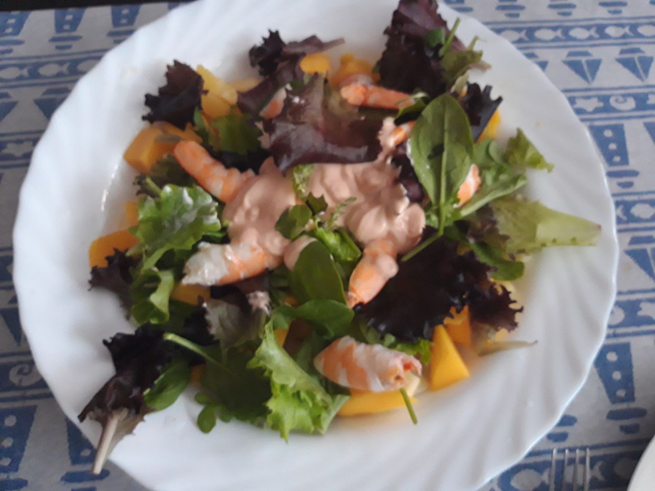 La ensalada, cambio de última hora, sí la fotografié (Frutas picadas, brotes tiernos y langostinos en salsa rosa).
