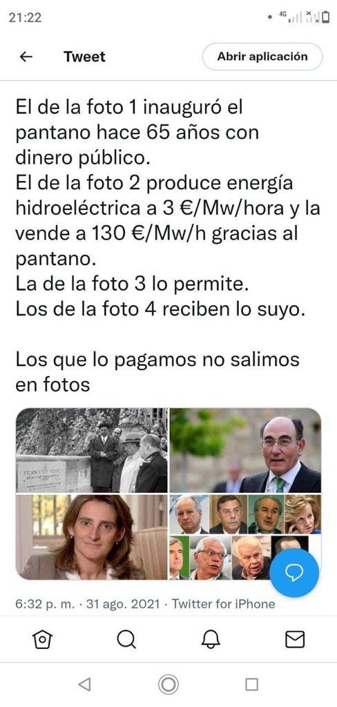 Y ahora viene el gobierno y dice que le da igual al precio al que tenga vendida su producción presente y futura, que el precio actual del mercado es de 150, 170, 180 € mgw/h y tú me tienes que pagar a mi, al gobierno, la diferencia entre el precio actual del mercado y unos 50 € mgw/h que me he sacado de la manga ... asi que las generadoras que tienen ya vendida su producción lo harán a pérdida, ya que ingresarán 40 o 50 pero deben dar al gobierno 120 o 130 ...