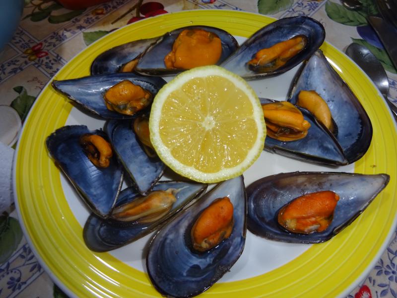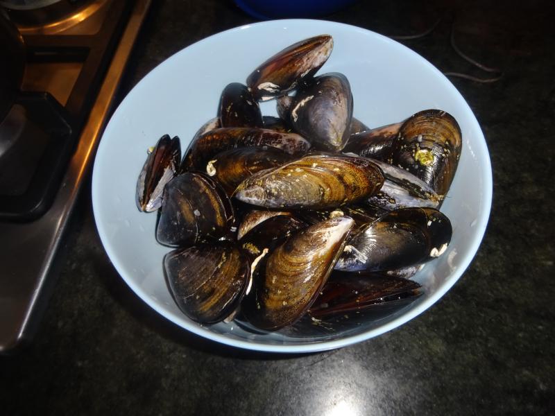 Voy a poner para comer unos mejillones de roca al aroma del Tio Pepe, luego jibion de invierno troceado en su tinta y de postre un poco del Cabrales que me han regalado.