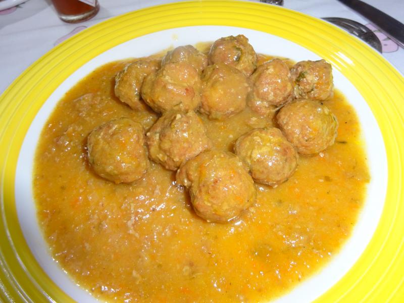 Una vez fritas todas las bolas las napamos con la salsa española, toque de pimienta negra, blanca y nuez moscada, se puede poner un ondaquino de brandy quemado que no estorba y se dejan a fuego muy lento una hora o así y ya quedan listas para ser engullidas, veremos que nos queda en la bodega pero a esta receta le va de perlas un potente tinto ya sea de Ribera o Somontano.
