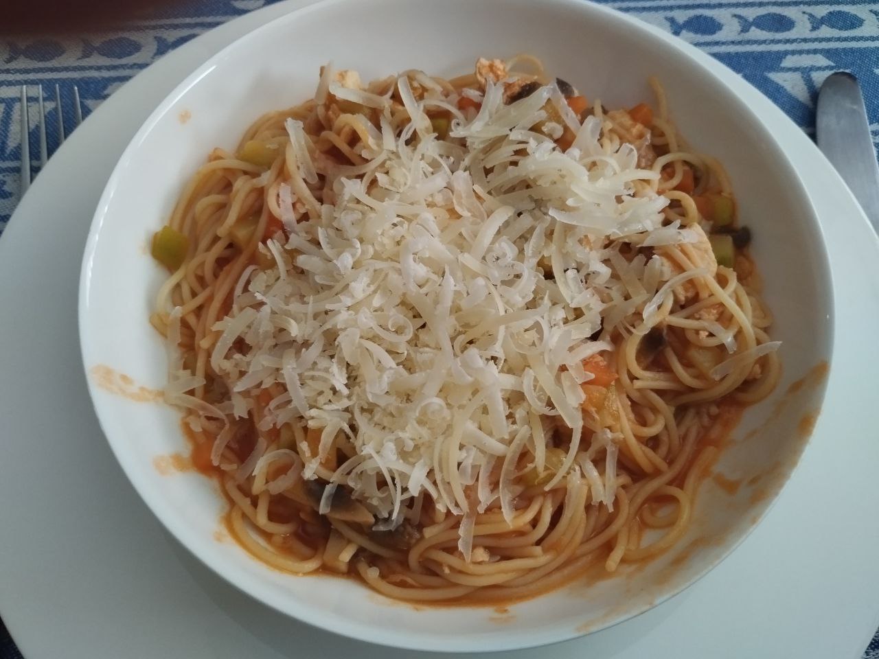 Espaguettis invención de mi Sargenta : Tomate casero, berenjena, zanahoria, calabacín y champiñones, todo eso muy picado, mas pechuga de pollo troceada. Queso tostado viejo rallado.