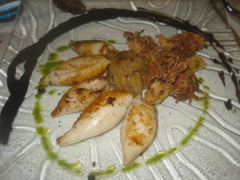 Cena un tanto de celebración con mi mujer, lubina a la plancha con vinagreta de gambon. Acompaña un Albariño. Quería rodaballo, pero eran descomunales, los pescaron con arpón, con eso queda dicho todo