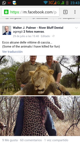 Veamos, de lo que se trata aquí no es de que se haya matado a un león, si no del contexto en el que se produce, un sujeto pudiente sufre un antojo felino y se nos planta en África, suelta 50.000€ a cambio de creerse con derecho a hacer lo que se salga del arco del triunfo.O sea, lo que es ilegal, de repente y gracias a la interactuación de la pasta, muta y se vuelve legal?.Lo que ocurre aquí es que este tipo de gente vive tan al margen de la realidad que hasta se creen sus propias mentiras, dentro de su mundo de unicornios de sangre azul, me juego una mano(la mano buena XD), que ese pájaro ni siquiera contempló la posibilidad de verse perseguido por la comisión de un delito en "tierras lejanas", claro, esas cosas solo les pasan a los plebeyos, nunca a alguien como él, y encima en un país "de negros pobres" pero mira por donde, la realidad a veces es tozuda.