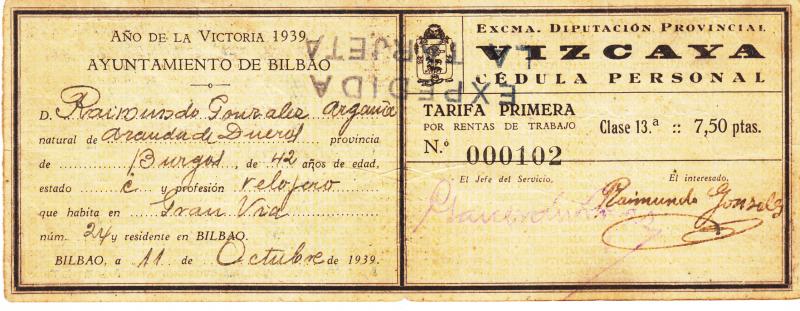 CEDULA PERSONAL DE 1939.