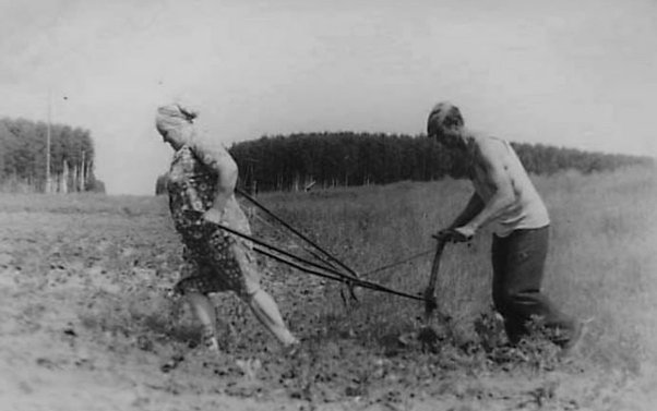Antigua foto de una pareja rusa, el hambre no entiende de sexos, cuando aprieta los complejos pasan a segundo plano y todos cooperan.