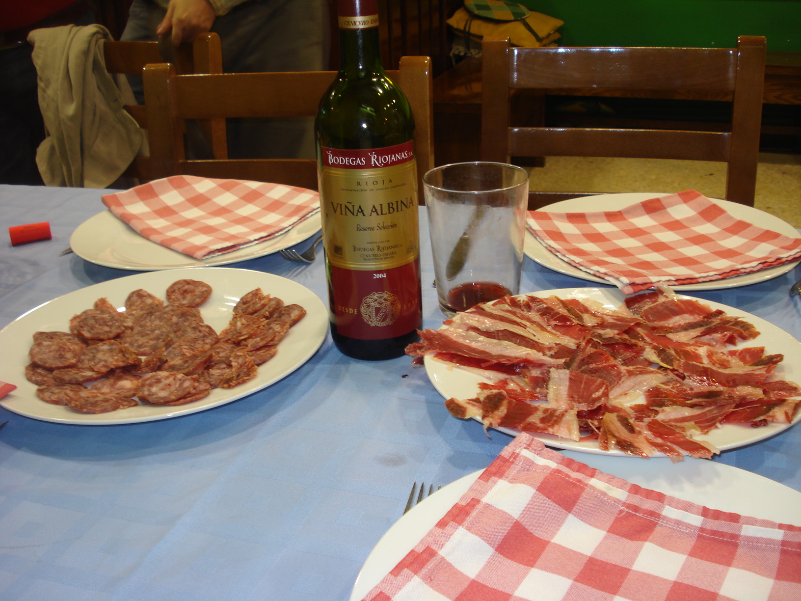 Lo pasamos muy bien y merendamos algo ligerito, jamon, chorizo, salchichon, queso manchego muy curado, regado todo ello con vinos de Rioja y como postre una enorme caldereta de cordero con verduritas albardadas, lo que llaman por ahi fuera Menestra de Cordero.