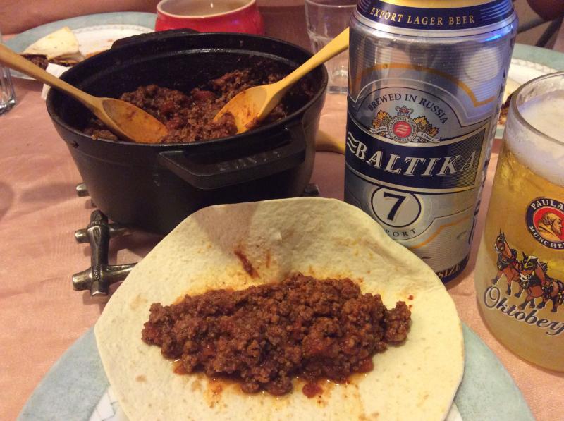 Flautas de Chile con carne (repito plato gringo de hace algunas semanas) pero, ahora, con cerveza rusa -tipo lager- Báltica #7.