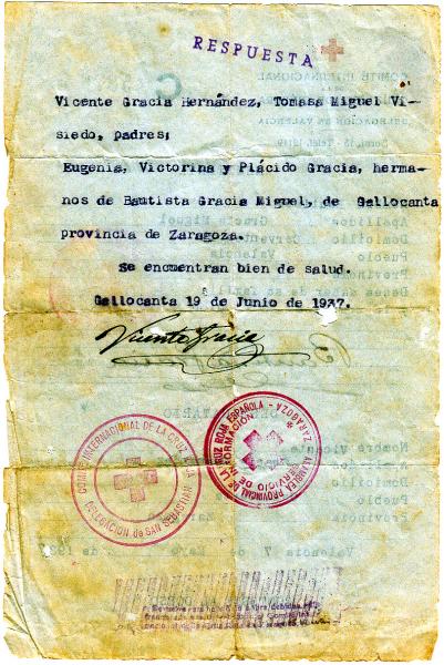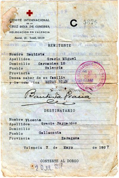 El siguiente documento, forma de comunicarse entre familiares de las dos Españas, durante la guerra incivil, mediante la Cruz Roja Internacional cuya sede principal esta en Ginebra Suiza.