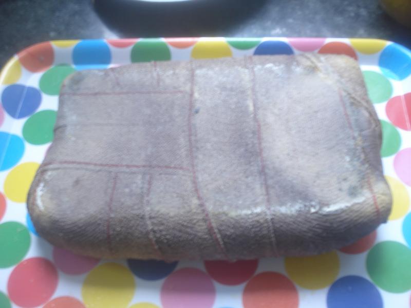 Una vez liberada de la prensa este es su aspecto actual, luego le quitaré la cubierta protectora para ver la gallina terminada y lista para filetear y emplatar.