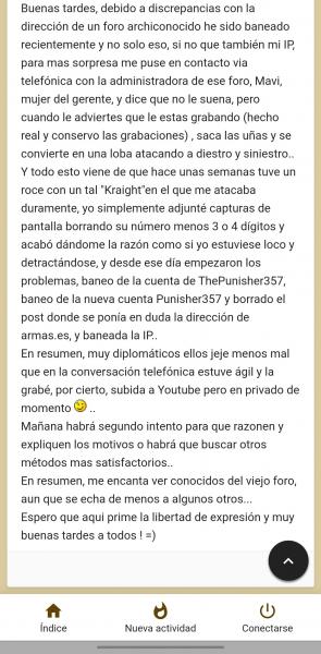 En ese tiempo otros usuarios proceden a contactar conmigo y uno de ellos firme en su decisión la adquiere, en el instante de estar formalizada la venta informo al usuario ThePunisher357 de que la culata esta vendida el cual alude que "se debe respetar el orden de llegada" y se enfada,me informa de que dara parte de mi comportamiento en el foro y me pide confirmación para divulgar públicamente las conversaciones privadas mantenidas, en las cuales hay datos personales mios y por ello le informo de que no doy mi consentimiento, Recibo unos últimos mensajes antes de finalmente bloquear al usuario ThePunisher357 en los que me informa en actitud chulesca que ha publicado nuestras comunicaciones privadas a través de un grupo de whassap (al cual no tengo acceso y desconozco si es veridico).