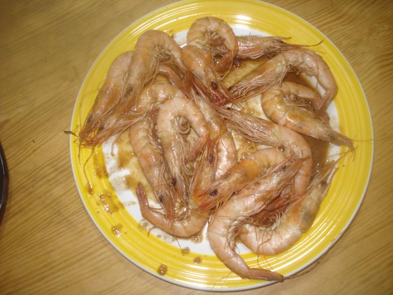 Hoy para comer gambas blancas frescas de Huelva traidas por un amigo piloto, las pescaron ayer y estaban bien tersas y con la cabeza bien pegada a la cola, extraordinarias, muy muy ricas. hacía mucho tiempo que no las cataba de esta magnifica calidad, he quedado muy agradecido y muy contento, en la plancha solo enseñar el calor para que no se pasen, justo justo al dente.