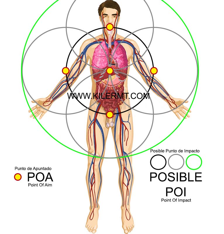 En la imagen podéis ver un circulo negro, si el tirador apunto a esa zona y realizo un tiro perfecto, donde todas las variables posibles se calcularon, spind drift, viento, etc... podría haber fallado, aun teniendo una probabilidad de impacto muy alta. Si el disparo no fue perfecto en lo que se refiere a la hora de apuntar y hubiese disparado en cualquiera de los puntos dentros del circulo verde, aun siendo un mal disparo, existe la posibilidad de que de al blanco, aunque esta probabilidad exista, es muy baja, pero podría impactar, en el caso de los círculos grises, que aunque hay dibujados 4, se podrían hacer todo al rededor y habría una probabilidad de que la bala impactar en alguna zona vital. Esto mismo se puede trasladar a un blanco, como una chapa.