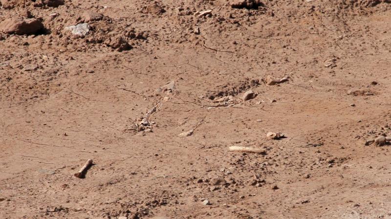 Que son huesos huesos puedo confirmarlo al 99.9% de seguridad. Es muy difícil determinar la procedencia de un hueso por una foto sin saber referencias de tamaños y planos de cerca. Aunque se ve lo que parece un fémur parece demasiado "gordo". En los humanos adultos un femur suele tener unos 2.5cm por la parte central (descarto tibia y perone por el cambio agudo de angulo del final de uno de ellos aunque falta la cabeza del femur). Y el pedazo de bóveda craneal parece un lado del parental pero esta demasiado curvo para ser humano y, o esta muy erosionado por los elementos o esta afectado de sarcoma oseo o una osteopenia grave. La costilla que aparece puedo decirte es de las costillas superiores que van unidas al esternón la 3" o 4" por su curvatura. Yo si tuviera que "apostar" te diría que no son humanos aunque si ves algo "raro" llama a la GC que no te van a poner pega alguna. Lo mas reconocible de la anatomía humana es el cráneo y su mandíbula( cuadrada en forma de caja y con los dientes tan particulares que tenemos los humanos, sin colmillos pronunciados).