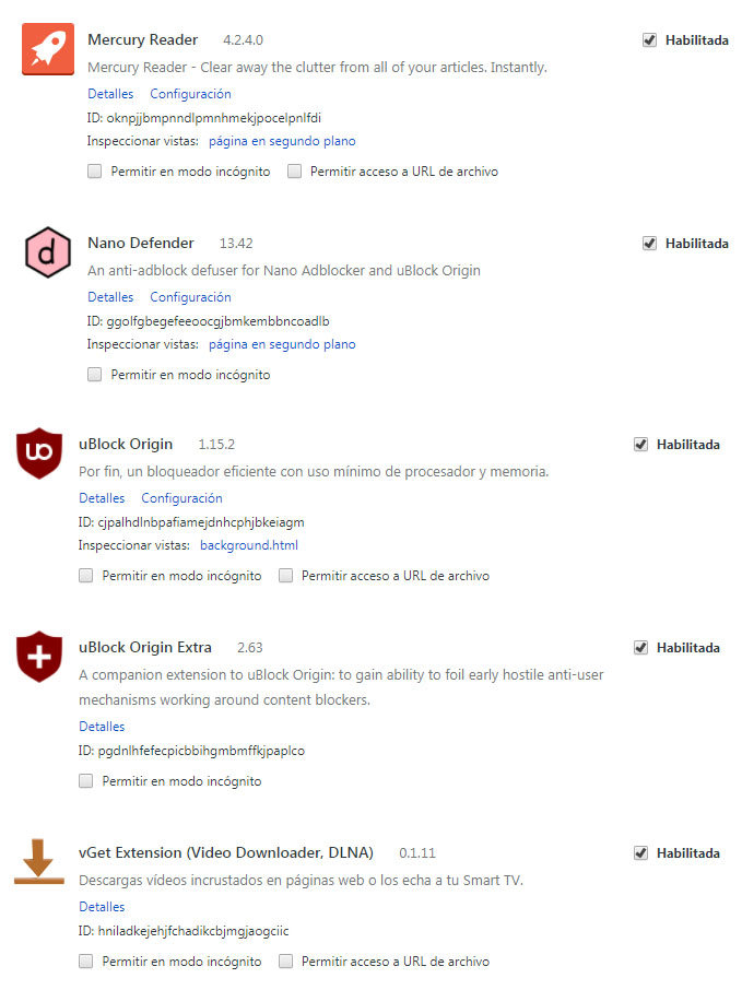 Os adjunto captura de pantalla con las extensiones activas de mi Google Chrome, por si les resulta útil a los webmasters.