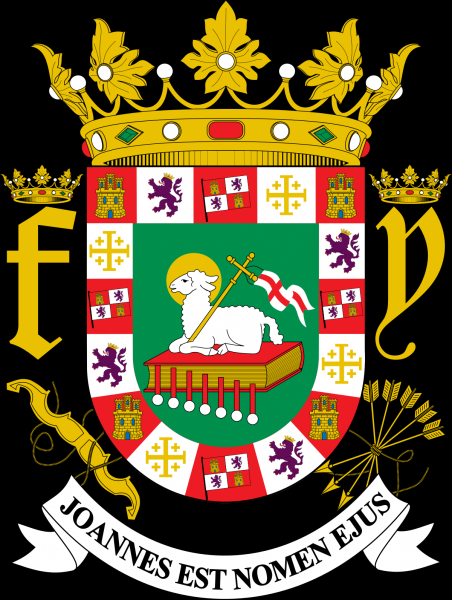 Monedas de los Reyes Católicos, y escudo de Puerto Rico.