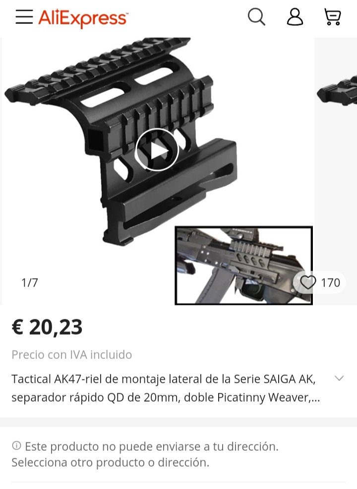 DeadPool escribió:Buenas, a alguno le ocurre que le es imposible comprar accesorios para armas, ya sean de CO2, airsoft o blancas por Aliexpress? Hace unos años compré unas fundas y unos raíles, pues que sorpresa que después de unos años volví a entrar hoy en la app y buscando los mismos productos que antaño había comprado no me aparecía nada y buscando en la web me salían los productos...clickaba para acceder a los anuncios y me saltaban con mensajes como estos que adjunto en las imágenes siguientes.