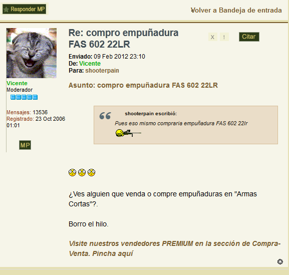 Hola amigos , llevo poco mas de 2 años navegando por el foro , a veces hay meses que ni entro por falta de tiempo , y al cabo del tiempo descubro que no podemos equivocarnos , solo he puesto 2 anuncios creo, y el segundo me lo borran de esta manera que veis abajo , creo que no es justo , al menos se podia haber pasado a ACCESORIOS PARA EL TIRO , creo que para eso es uno moderador , y no para aplicar aqui las formas que nos aplican la IA , los politicos y otros enemigos de las armas, espero que no sea el procedimiento habitual.