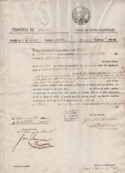 La foto de arriba hipoteca de 1857 de una vivienda de Cádiz pagada con Reales de vellón. (la peseta es oficial desde 1869) arriba pone BIENES DEL CLERO