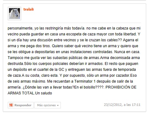Respecto a ese señor, yo estaria dispuesto incluso a darle la razón en lo referente a que solamente deberian de poseer armas de fuego las fuerzas del orden, a cambio, por supuesto, de que alguien tuviera el generoso "detalle" de desarmar a los delincuentes.