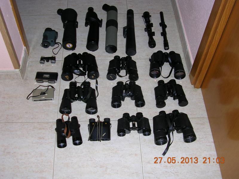 Estos son mis aparatos para ver mejor, como yo les llamo, en el coche tengo dos prismáticos más y hace poco regalé tres en el Club de Tiro, entre los que veis hay unos Leika Trinovid que como sabeis son bastante caros, creo que demasiado.