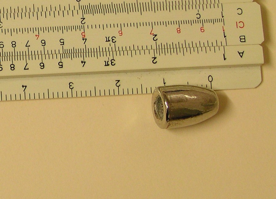 Agradecería si alguien me puede decir de que fabricante es el proyectil de la fotografía. Corresponde a un cartucho del 9 mm Corto, recargado, la punta está sacada con martillo de inercia por lo que se ve alguna marca, pero no está disparado. Pesa 100 grs., es ligeramente troncoconico y con la punta un poco redondeada, base hueca y cromado.
