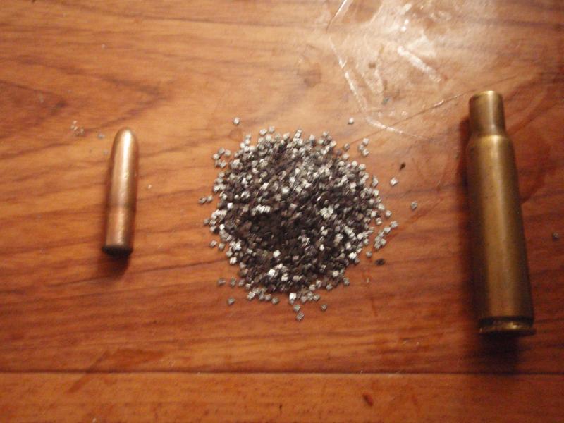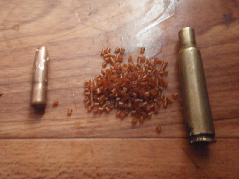 foto nº3 cartucho desmontado con otro tipo de polvora que no se cual es.la punta y vaina igual que la anterior,pero menos greins de polvora 40greins