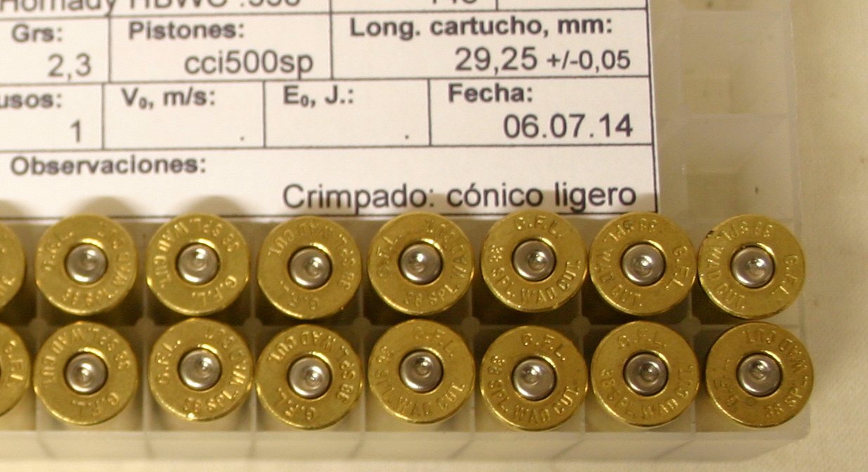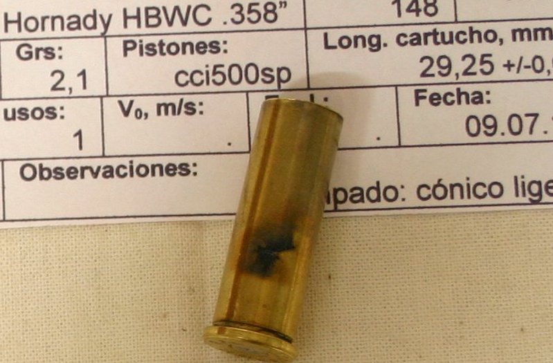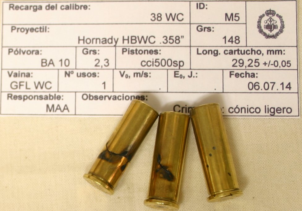 Habitualmente recargo el 38 WC con 2,4 grs de GM3, la BA10 suelo usarla únicamente con el 32 WC, el 9 Corto y tambien para recargar 38 SPL con puntas RG Pugnator SWC, con 3 grs. Estos días he utilizado BA10 para el 38 WC y me he encontrado con varias vainas rajadas, le he metido 2,3 grains de BA10, y de 15 cartuchos 2 rajados y uno "picado". Con 2,1 grains de BA10, de 5 cartuchos 1 rajado. No he medido velocidades, la pólvora es el final de un bote que tiene ya un par de años y hasta ahora no me ha dado problemas. En los pistones no noto síntomas de sobrepresión, en el disparo tampoco he notado nada fuera de lo normal y comparándolo con el 38 WC original de Fiocchi apenas hay diferencia.