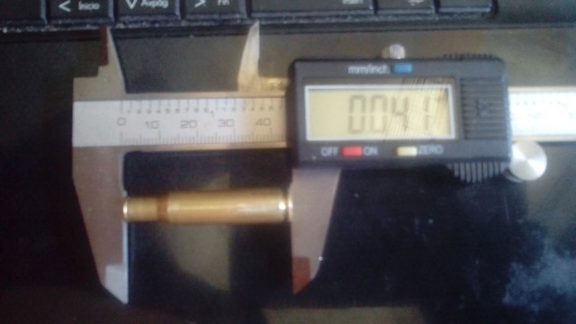 Es decir, pones la vaina, ajustas a cero el pie de rey, luego metes el cartucho del .22 de manera que lo que midas sólo sea el culote.