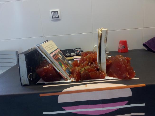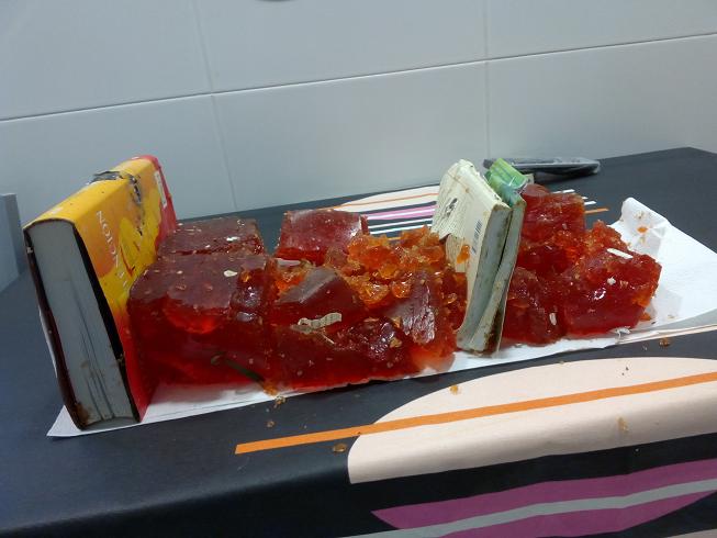 Opinión: La mezcla que preparo sale al 50% aprox., y como dije el otro día, creo que no es todo lo consistente que debería. Hice una prueba le otro día con una mezcla al 100% con la carabina (ver foto siguiente) y si que empieza a ser un bloque más decente. La pega es que ya te vas al doble de pasta y que probablemente acabéis con el suministro de gelatina de tu ciudad, :mrgreen: :mrgreen: :mrgreen: