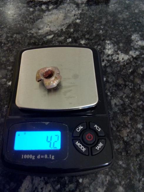 La bala recuperada, estaba formada íntegramente por la camisa, en concreto se recuperaron, 4,2 gramos recuperados de los 11,6 gramos originales, es decir, un 36,2% de peso retenido DESPUES DE ATRAVESAR EL PRIMER BLOQUE.