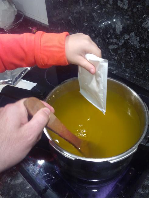 1.- Llenáis la olla con el agua y la pones a calentar. Parece ser que en agua caliente, la gelatina diluye mejor. No hace falta llevarlo a hervir. (OJO!!! No llenar la olla hasta arriba y dejarle 3 o 4 cm porque al echar los polvos hacen que suba el nivel)