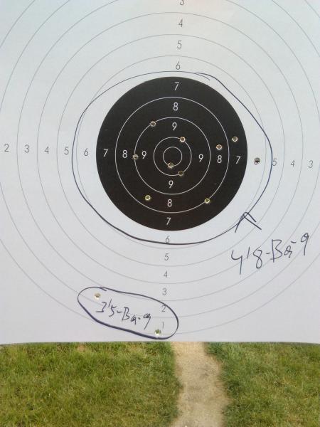La carga de 4,8 gr. anduvo bien la otra no, es una agrupación bastante buena, teniendo en cuenta el tiempo que no tiras con el Revolver. Podes hacer una prueba con esa munición apoyado en un saquito de arena y sentado para ver bien como agrupa la munición.