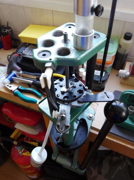 Con el tiempo adquirí una Dyllon 650, que es la que uso actualmente. Guardé la Rcbs hasta que ahora por economizar tiempo, ya que recargo varios calibres, he decidido montar de nuevo la Rcbs.