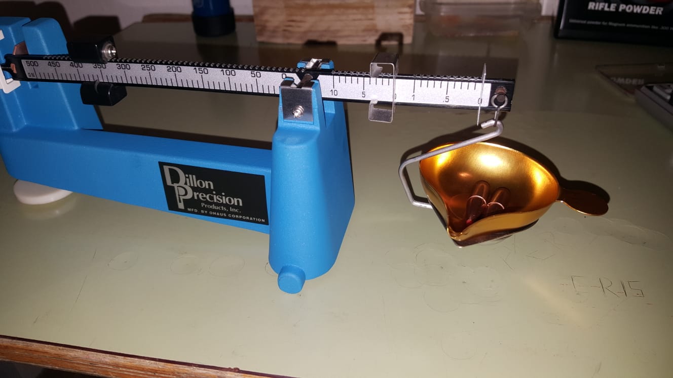 Ya me llego la bascula dillon eliminator y e comprobado que una bala de 180 greins si la pesa bien pero al poner dos balas y poner la pesa en 360 greins la abuja se queda por debajo,de que puede ser problema de la bascula