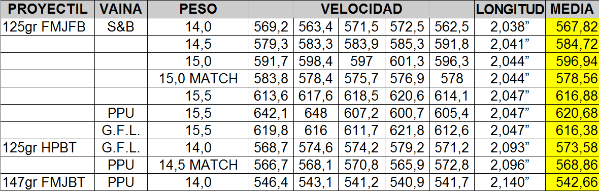 Buenos días majos, ayer estuve midiendo velocidades con unas cargas que hice con N110 y 3 proyectiles distintos, blindada de 125gr y base plana, punta hueca y cola de bote de 125gr y 147 FMJ. Las que mejor me agruparon a 50 m fueron las de 125gr FMJ con 15 grains de pólvora, espero os sirva a alguno para algo.