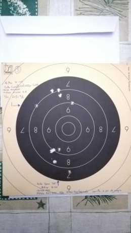 Buenas pues seguimos con más pruebas.... La agrupación a mejorado algo gracias a la torreta y saquete que he utilizado para la prueba. En mesa de tiro y a 100 mts de distancia.