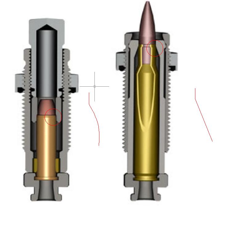 Si te fijas en el diseño del die veras que lo que haces al mover la rosca es girar, girar en una rosca es subir ó bajar, no veo mecanismo de presión lateral más que el ejercido por el cartucho al subirlo y obligar a la vaina a adaptarse a la forma que muestro en el dibujo, en arma larga es una forma Tapper línea recta, en corta al principio es Roll curva pero al final es una línea recta Tapper, es lo que me dice el diseño. En el die de arma larga puede que al bajar la rosca presione lo que parece esa arandela con pétalos pero me inclino más por el forzado de la vaina en el die más duro. La arandela creo que es para dejar la presión que quieras, luego al subir la vaina se deforma presiona, de otra forma tendrías que utilizar la arandela en cada bala como unos alicates.