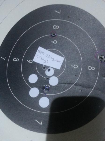 EN las fotos son 5 impactos de cada carga, con SP7 entran uno dentro de otro, lastima que me quedan gramos de esa polvora
