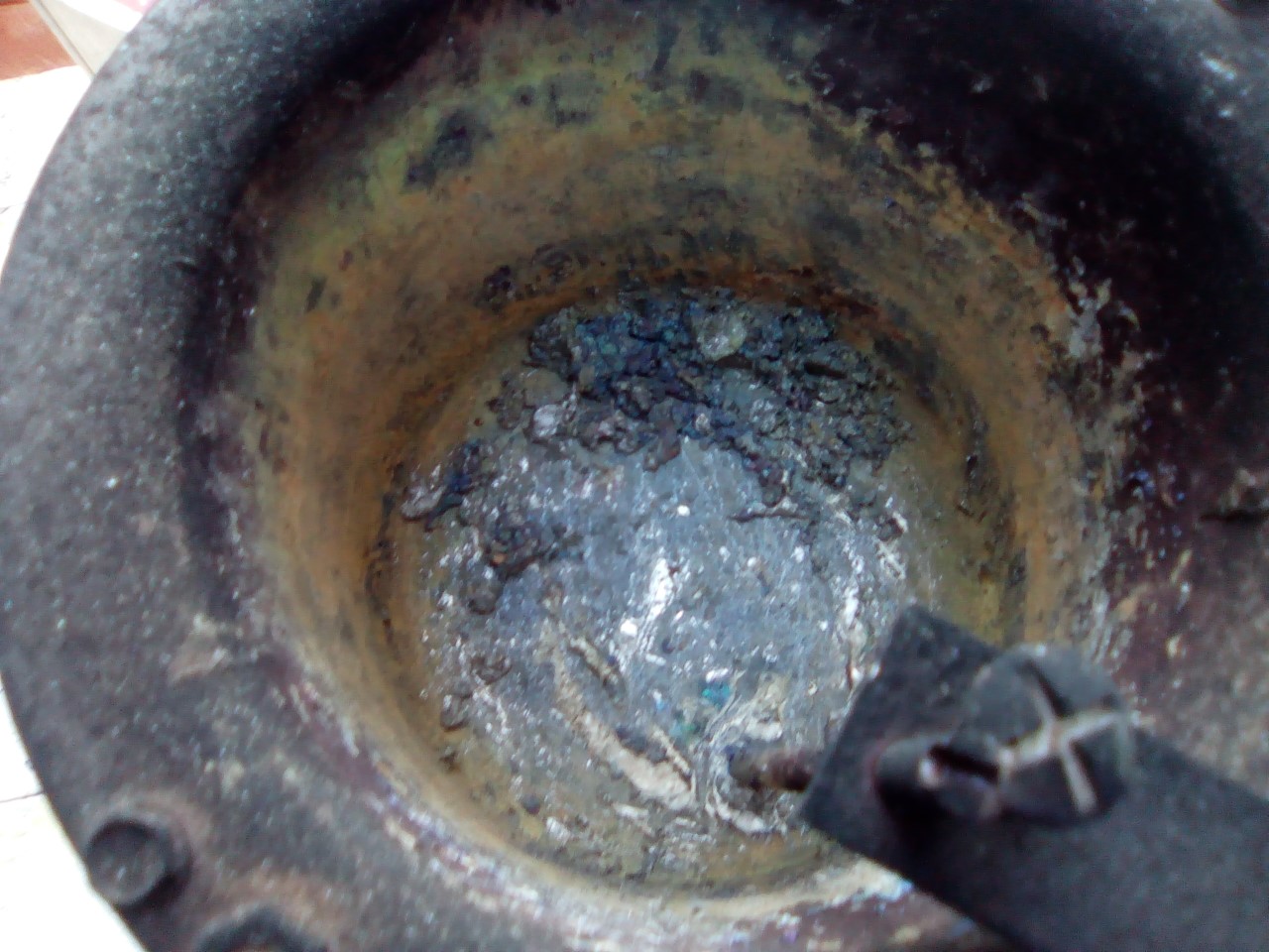 La primera es que no haces flux. Es tan fácil como echar un trozo de cera cuando está todo el plomo fundido, antes de empezar a fundir con la turquesa. Enciende el humo con una cerilla para que no se ahume todo el recinto.