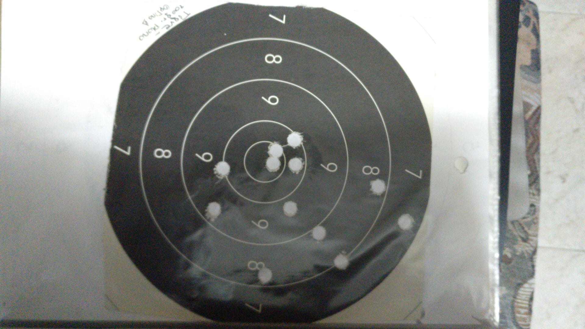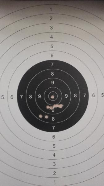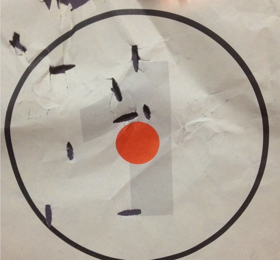 Rossi 92 45 Colt, 50 m, apoyado con los codos en mesa sin sacos ni ningún elemento de puntería, miras de hierro y apuntando a centro de negro.